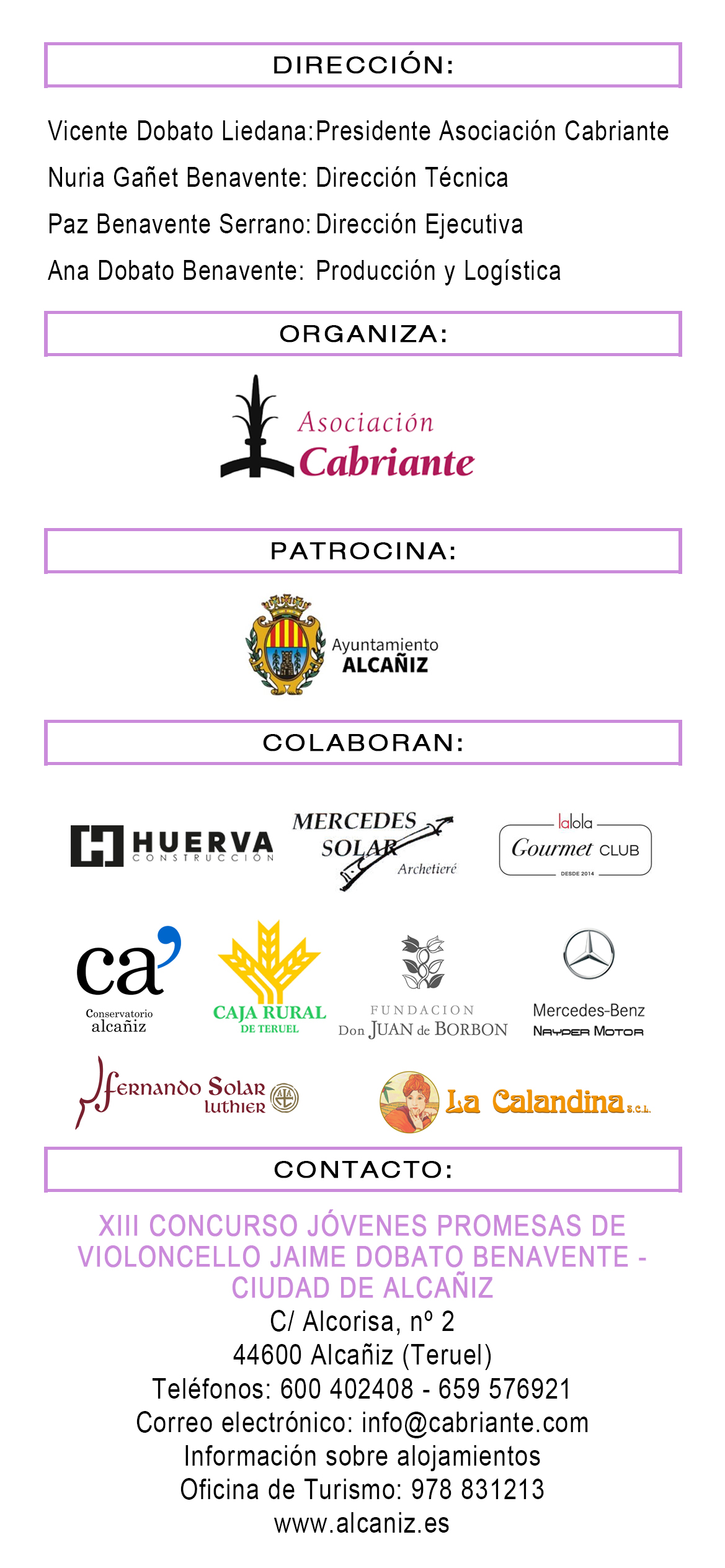 La Asociación Cultural Cabriante y el Ayuntamiento de Alcañiz (Teruel), en colaboración con otras entidades públicas y privadas, organizan el: “XIII Concurso Jóvenes Promesas de Violoncello, Jaime Dobato Benavente, Ciudad de Alcañiz”